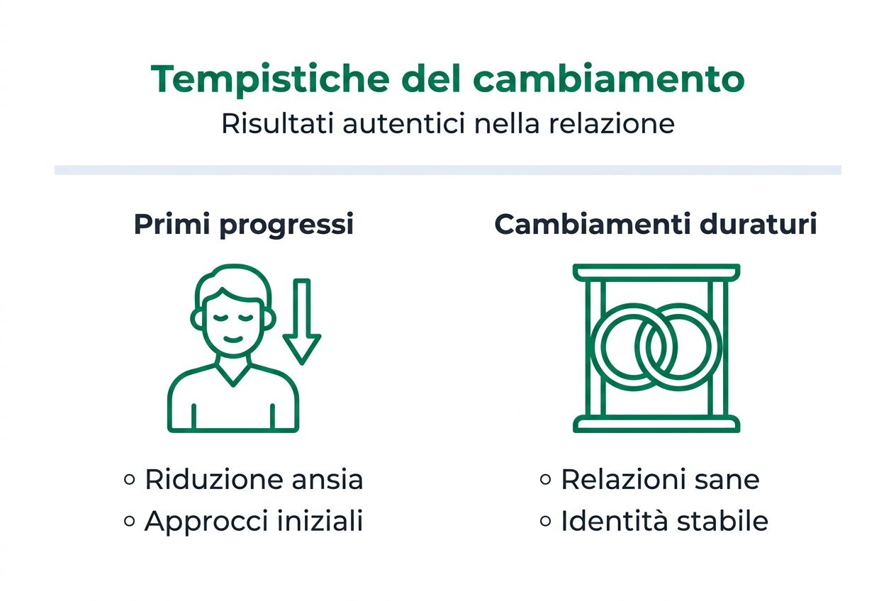 Con pratica consistente, noterai riduzione dell'ansia in 4-6 settimane e primi successi relazionali in 3-4 mesi. Le tempistiche variano secondo il livello iniziale di ansia, frequenza di pratica e qualità del supporto ricevuto. Concentrati su miglioramenti incrementali piuttosto che trasformazioni drammatiche. La crescita autentica è graduale ma permanente.