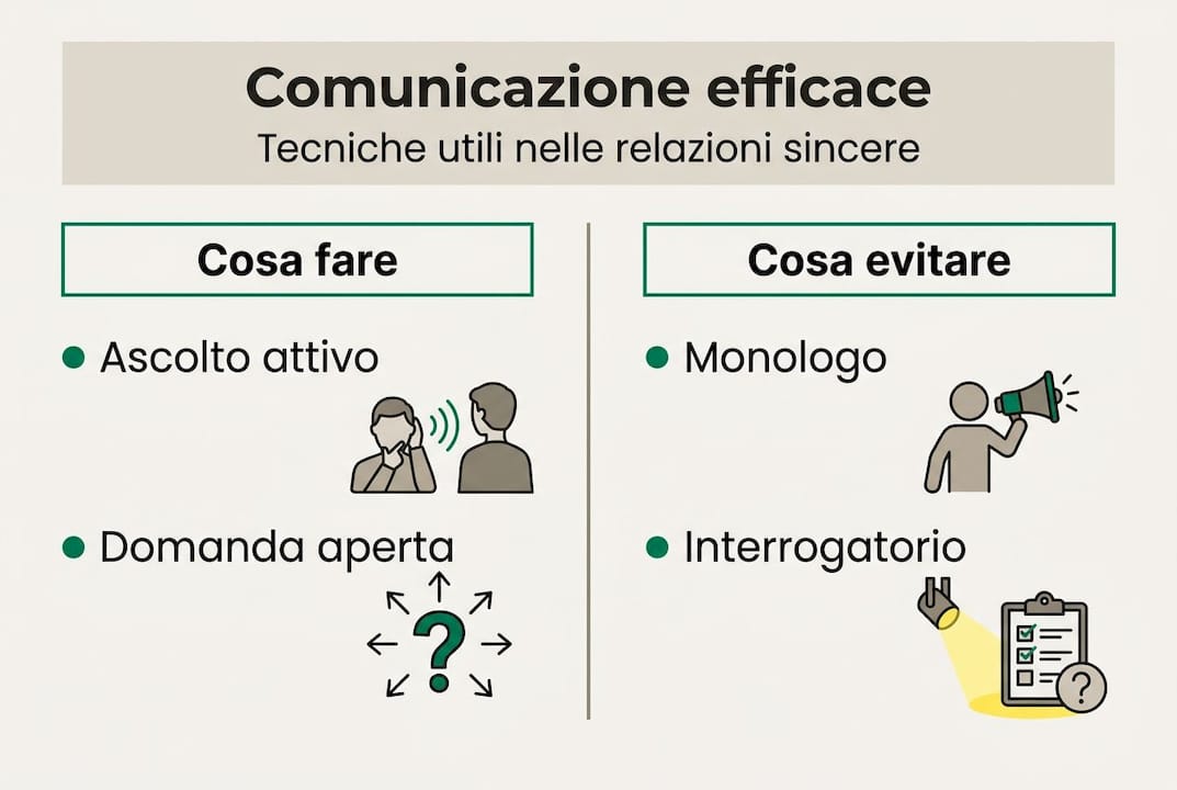 Con gli argomenti scelti, passiamo alle tecniche di dialogo che fanno la differenza. Non si tratta di trucchi, ma di abilità comunicative concrete che puoi allenare ogni giorno.
